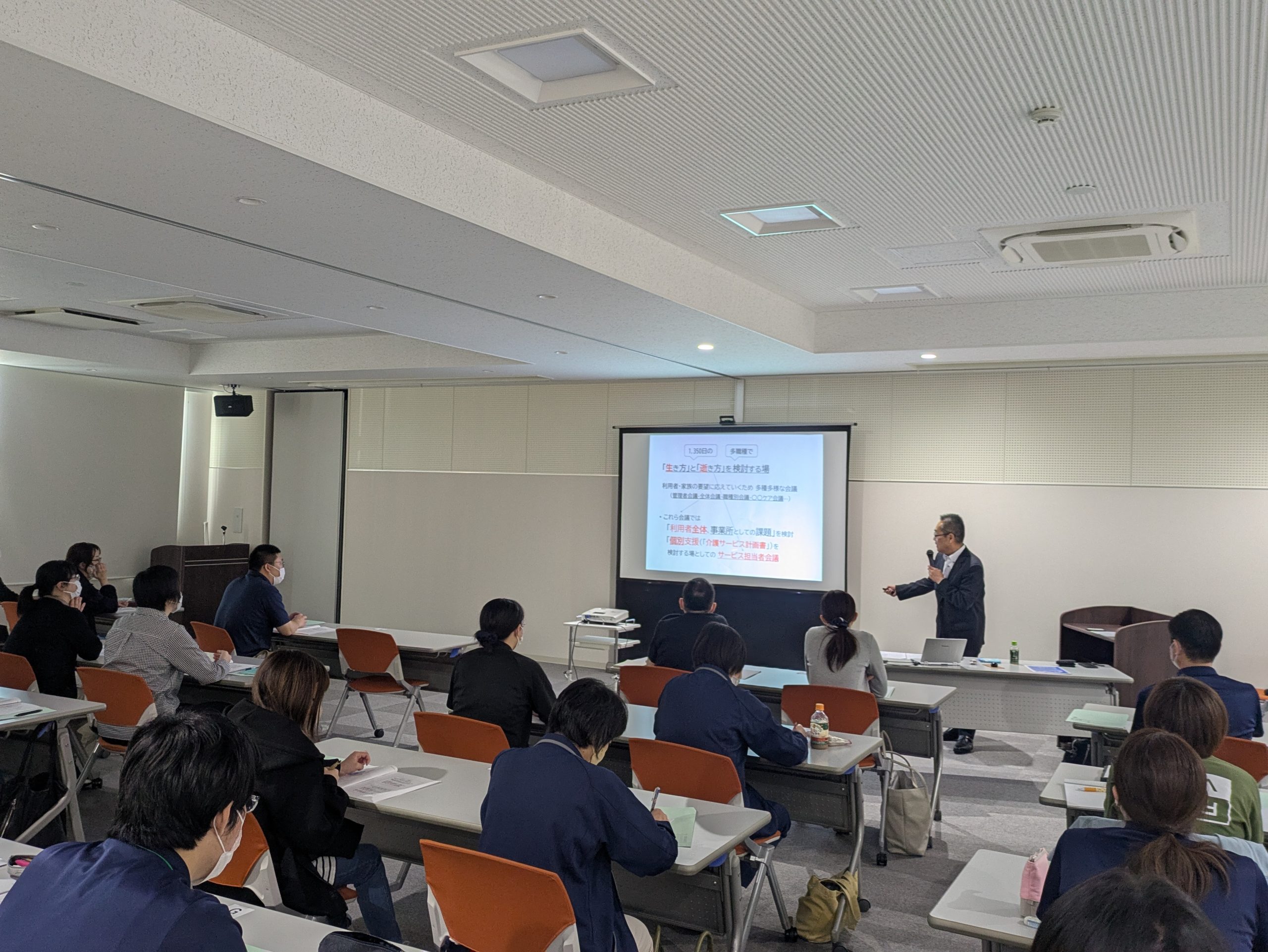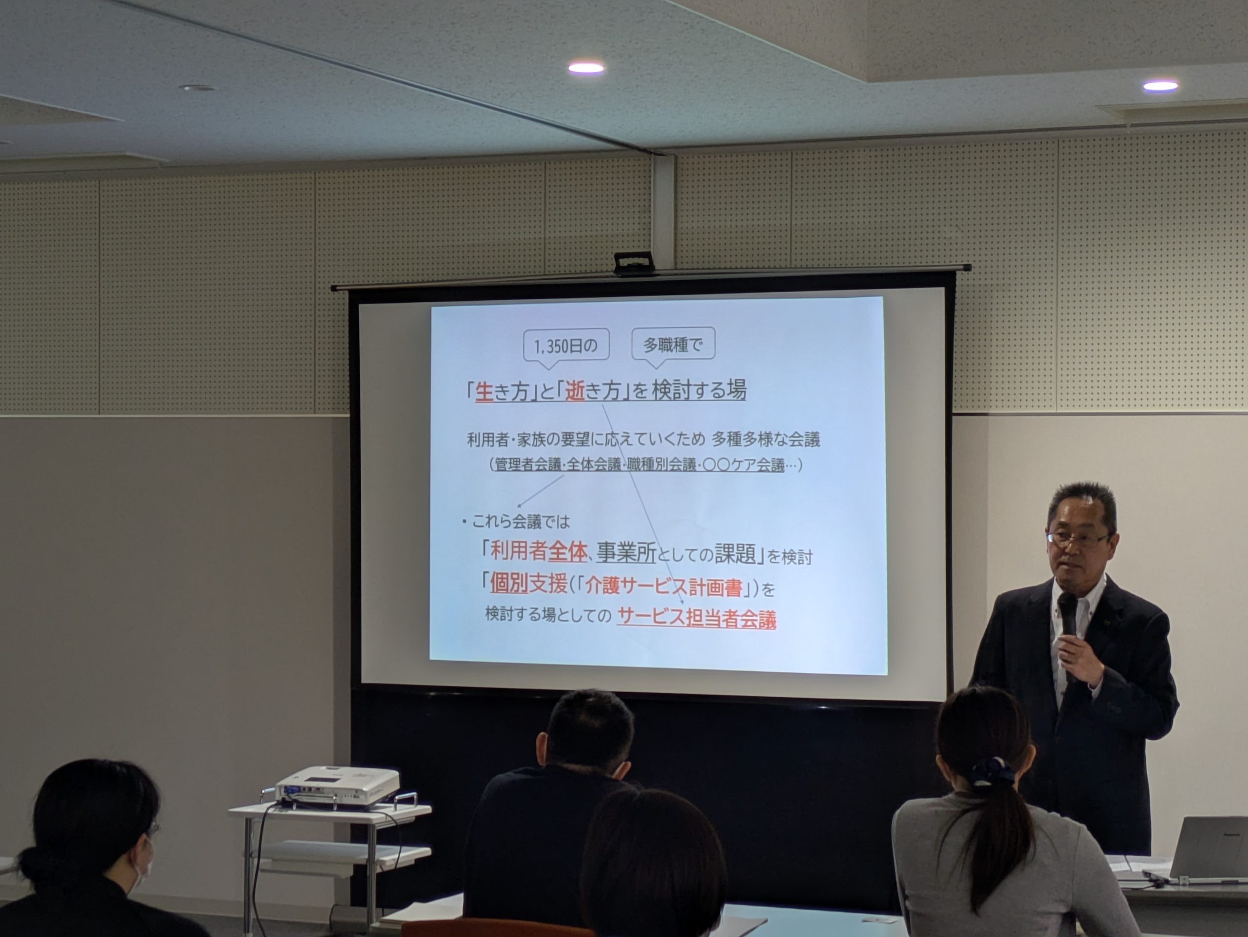 講義では、「死は生活の一部であり、特別なことではない。ただ、看取りケアはご利用者様の人生の最期に関われる特別なこと」、「入所時からの日常的なケアが、その先の看取りケアにつながる」、「多職種協働によるケアマネジメントの重要性」、「死を語ることをタブーとせず、日々のケアの積み重ねが質の高い看取りケアを支える」など、現場に直結する内容をわかりやすくお話しいただきました。