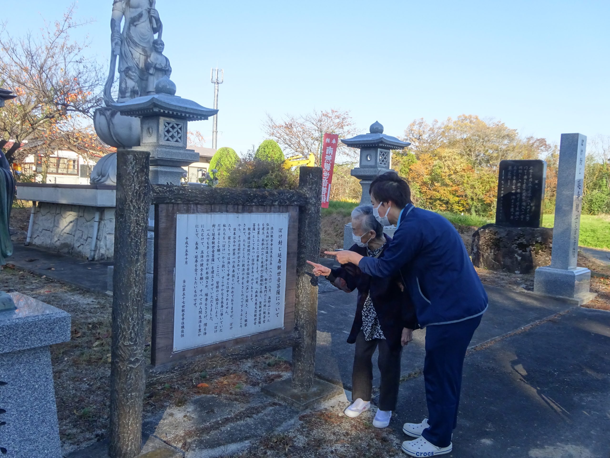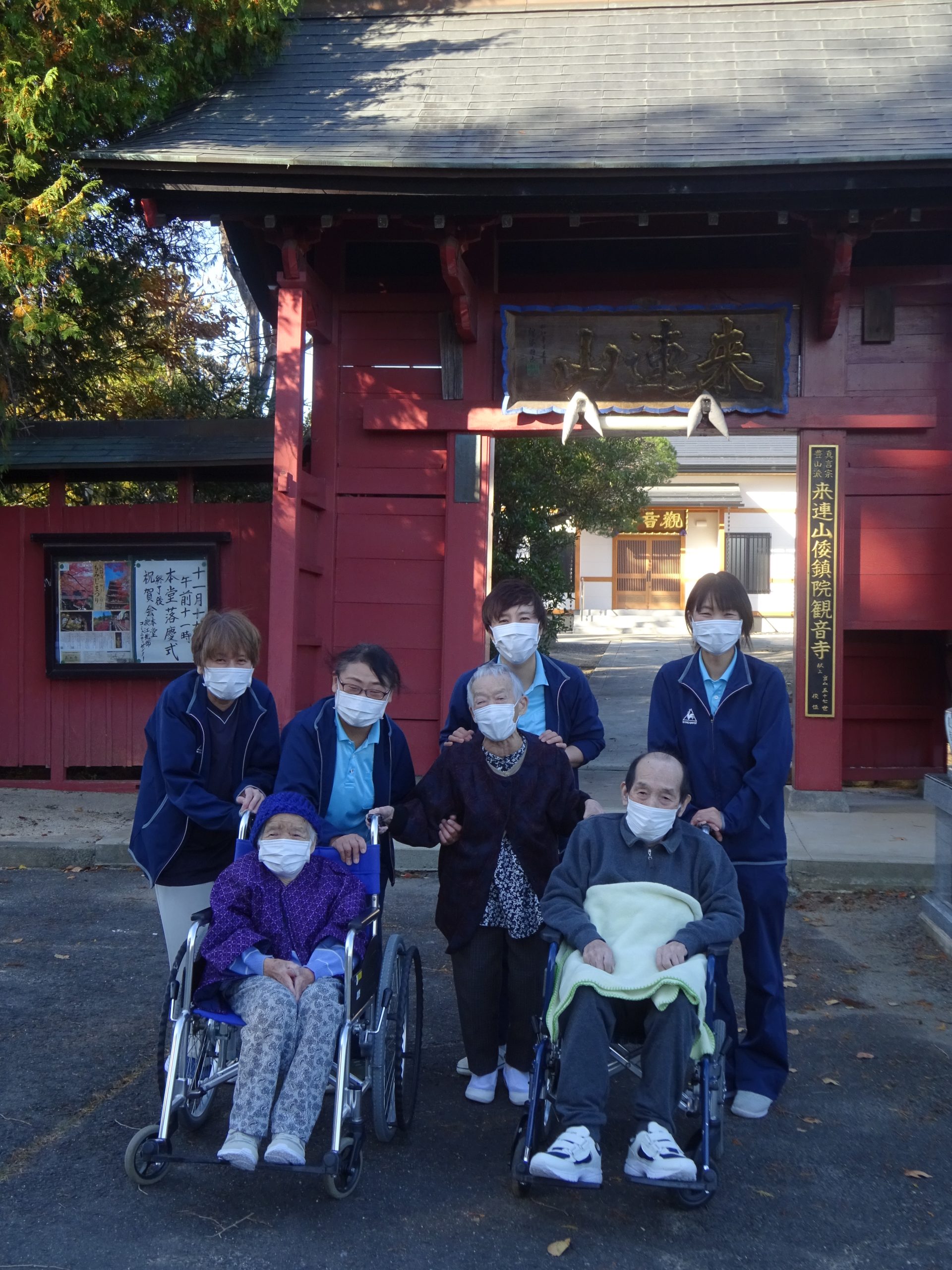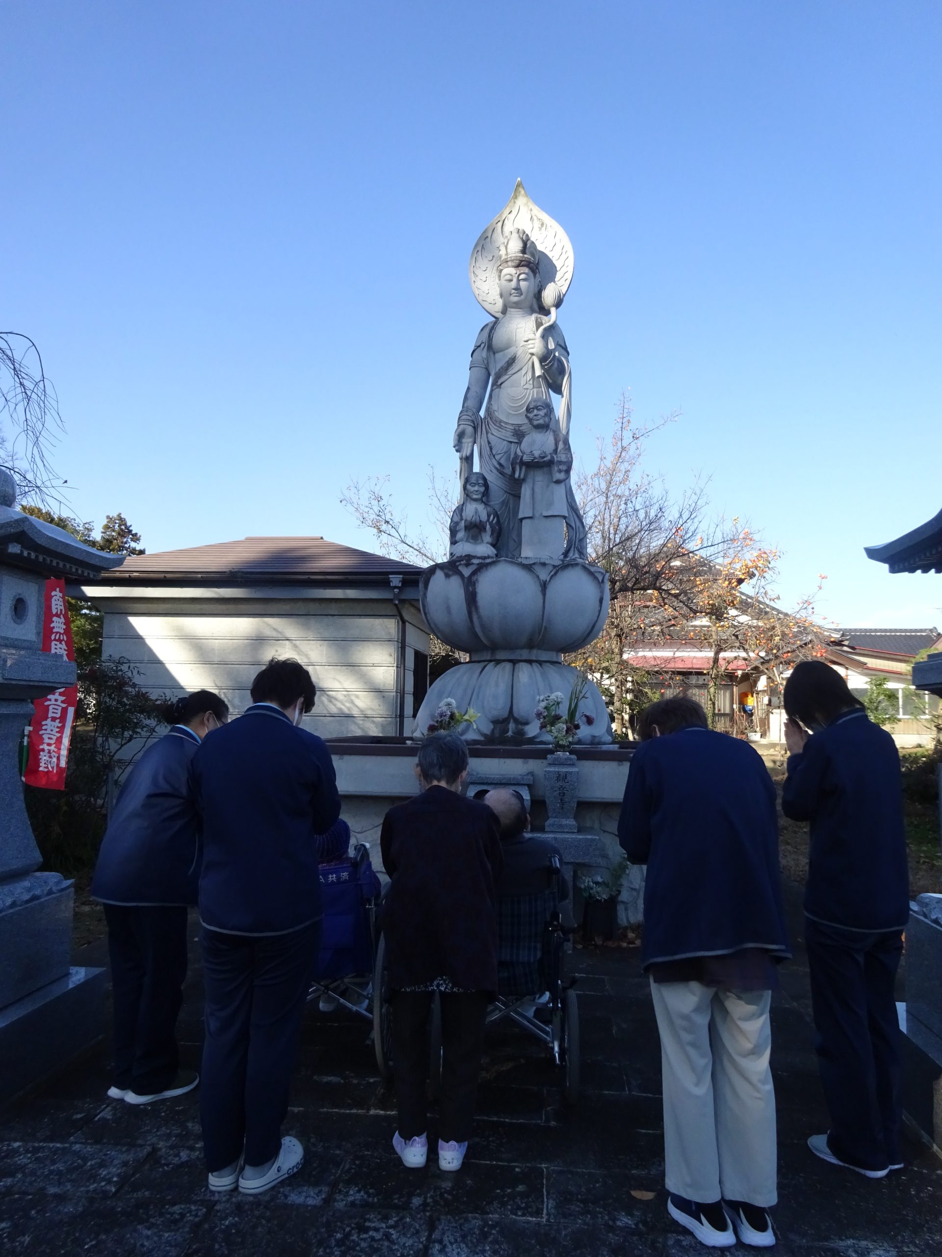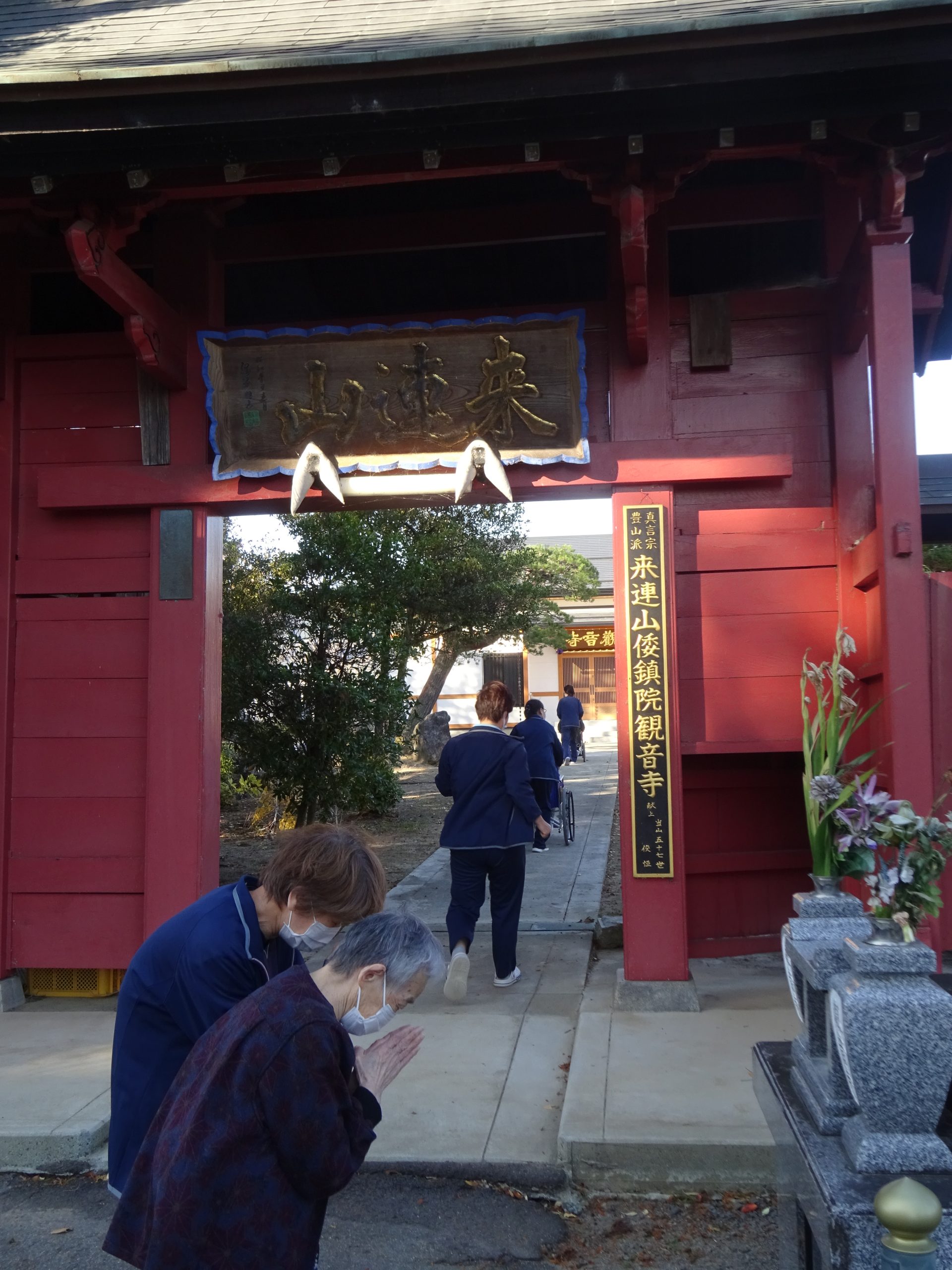 デイサービス ドライブに行きました 2025/11/19 先日、国見の観音寺にドライブに行きました。案内板によると、826年弘法大師が都の鬼門にあたるこの地に建立したそうです。ぼけ封じ延寿観世音菩薩との事で、拝んで来ました。「これからも怪我なく、病気なく過ごせますように」お寺の入り口で記念写真も撮りました。帰り際、五十沢の方へも足を伸ばし、ザル菊を眺めて来ました。「うわぁ!綺麗だねぇ」と大変喜んでいました。 « 前のページ