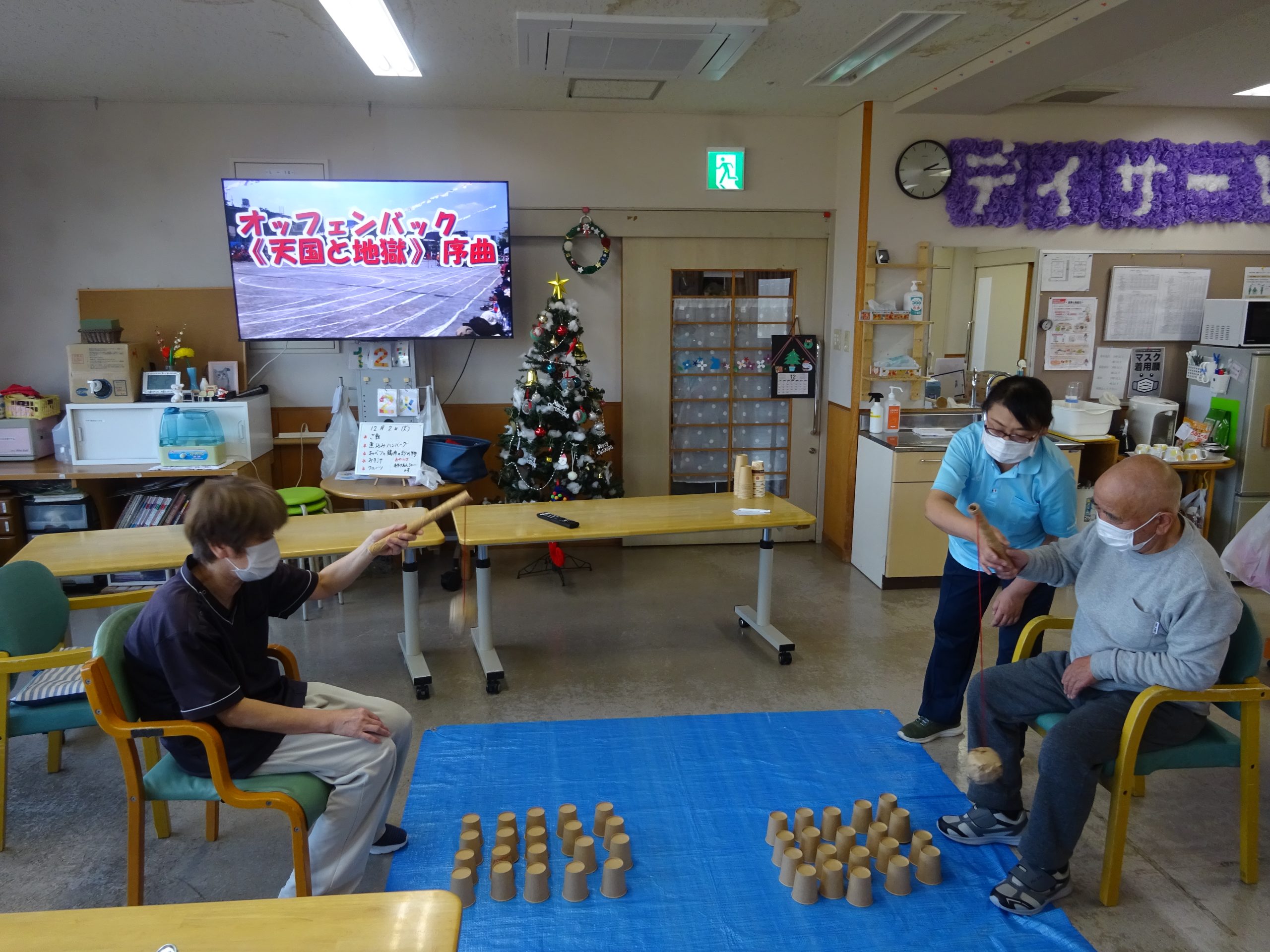 デイサービス 新ゲーム「ふりこゲーム」 2025/12/11 先日、新ゲームを行いました。棒の先にボールが下がっており、それを紙コップにぶつけて倒すゲームです。相手より早く倒せた方が勝ちとなります。夢中で楽しんでいました。応援にも力が入りました!「楽しいゲームだったね!」 « 前のページ 次のページ »