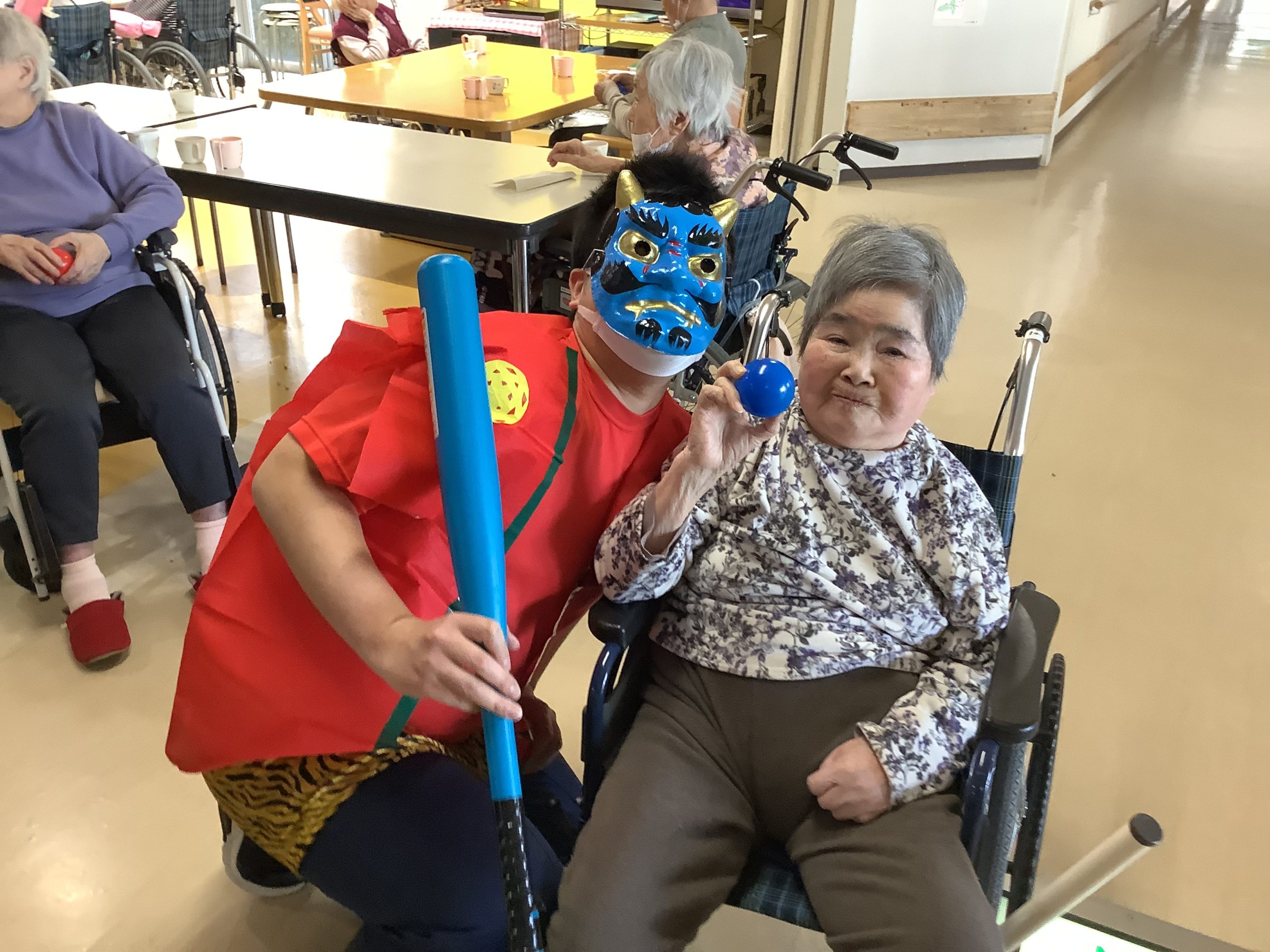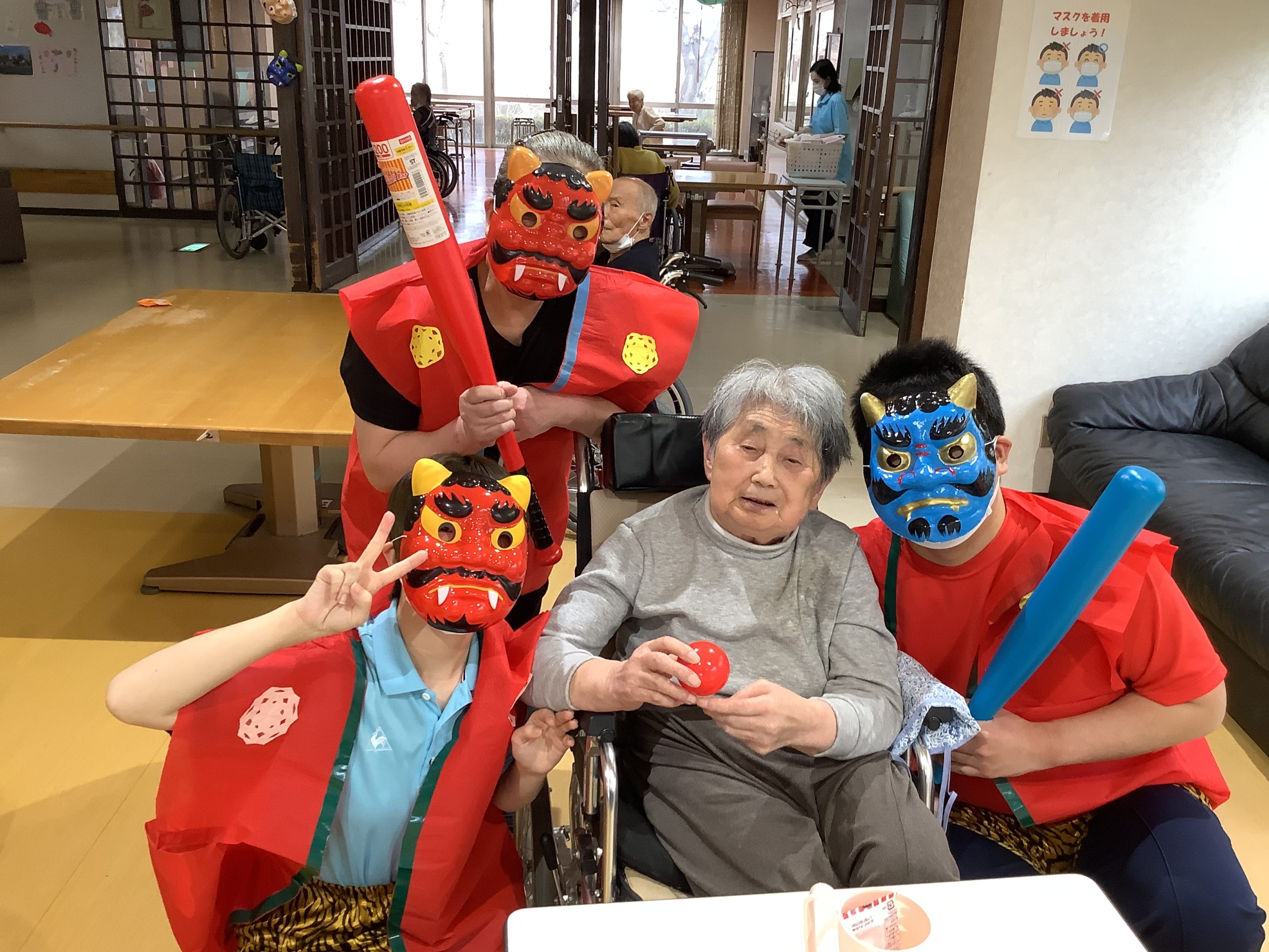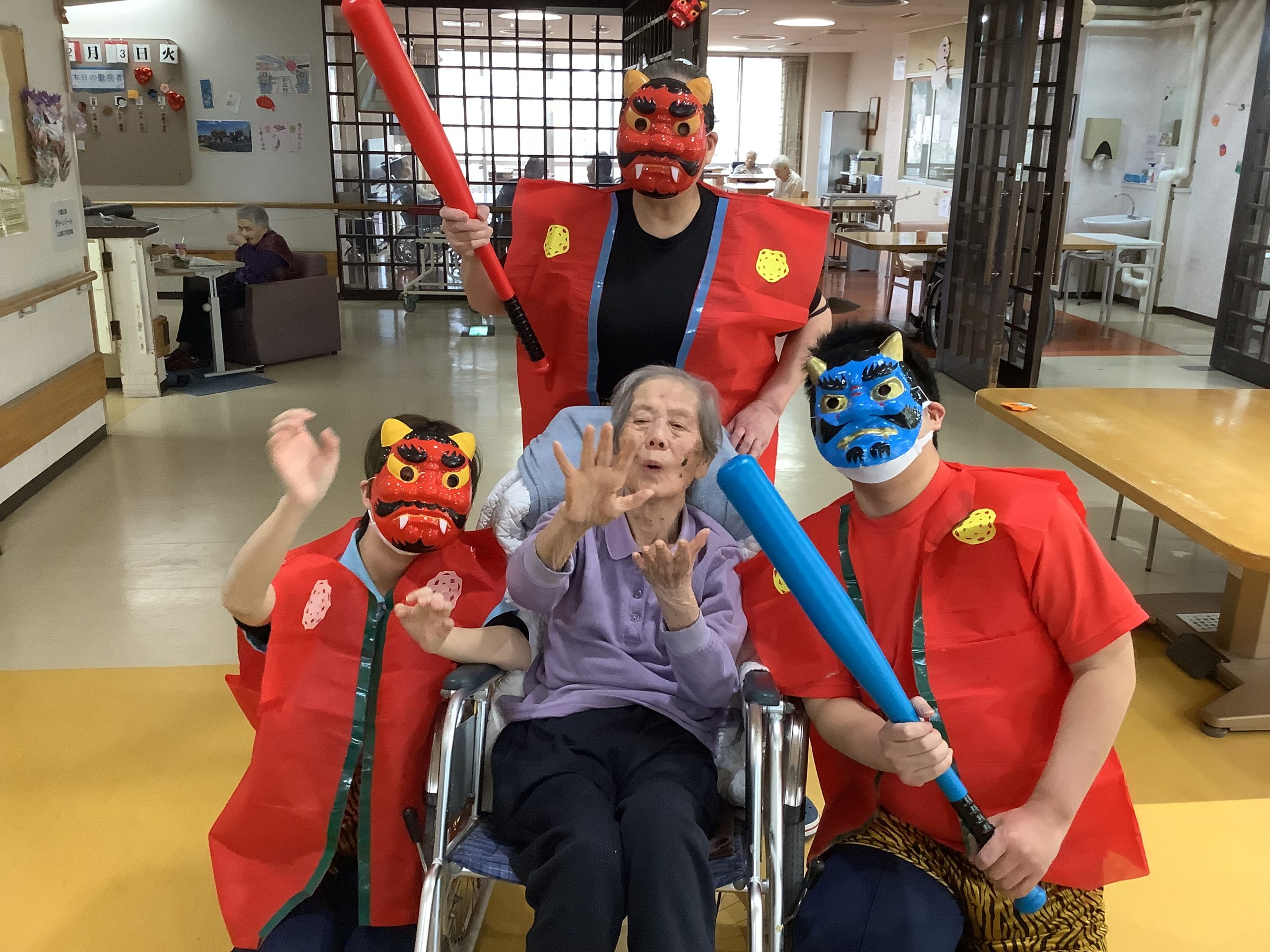 2/3 豆まきを行いました。 2026/02/04 2/3 職員扮する鬼が利用者様の間を回り、 「鬼は外!、福は内!」 とカラフルなビニールボールを片手に明るい笑い声や笑顔であふれました。 « 前のページ