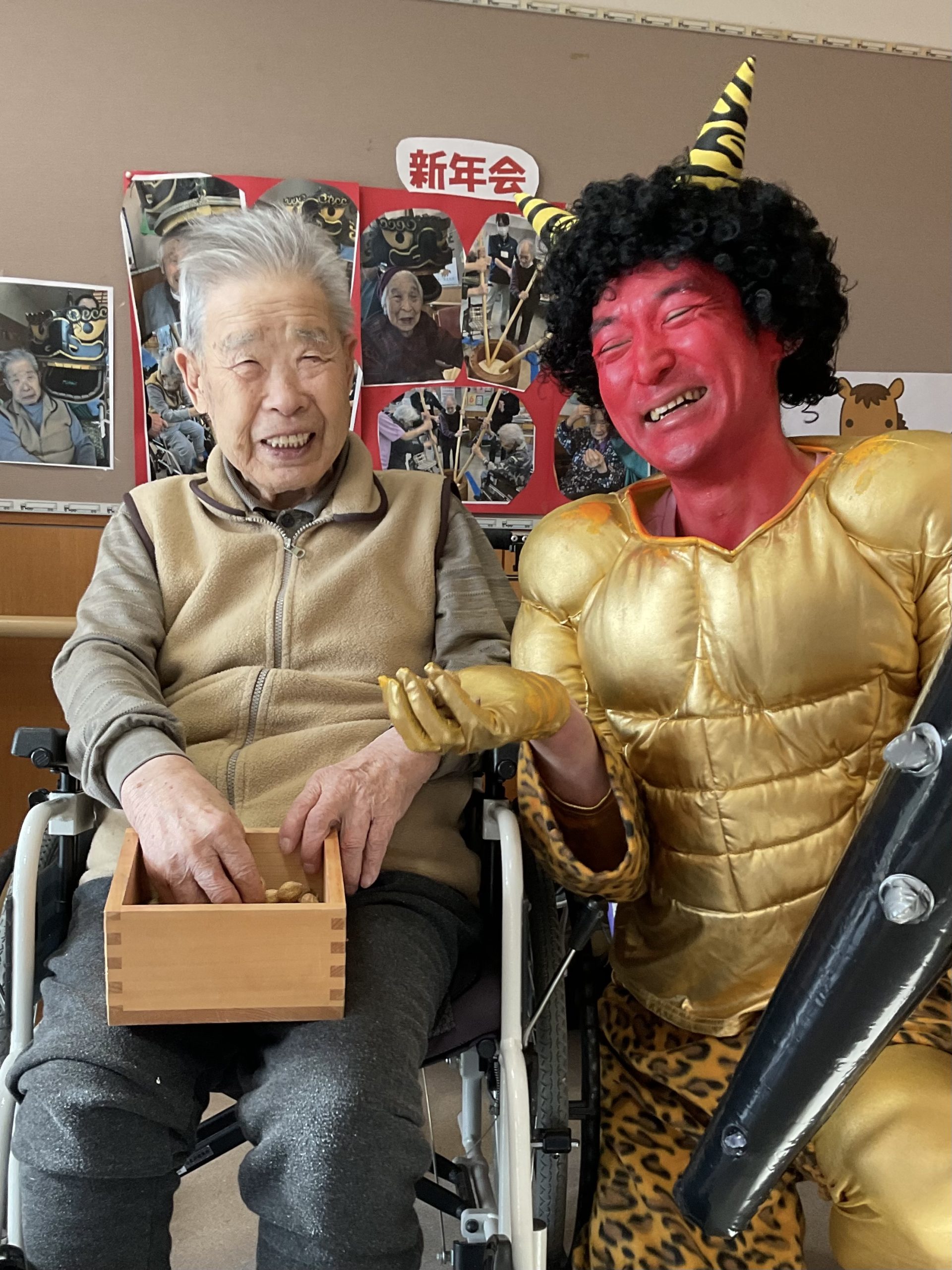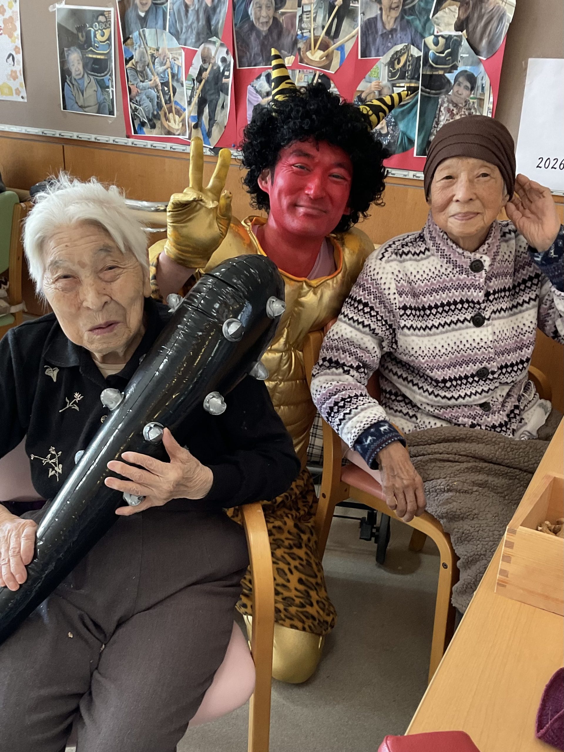 節分 2026/02/03 今年も節分行事を行いました。 赤鬼の登場に、利用者さまからは驚きの声や笑顔が見られ、にぎやかな時間となりました。「鬼は外!福は内!」の掛け声とともに、鬼に向かって豆を投げ、無病息災を願いました。 最後は鬼とも仲直りをして、皆さまで記念撮影を行いました。 « 前のページ 次のページ »