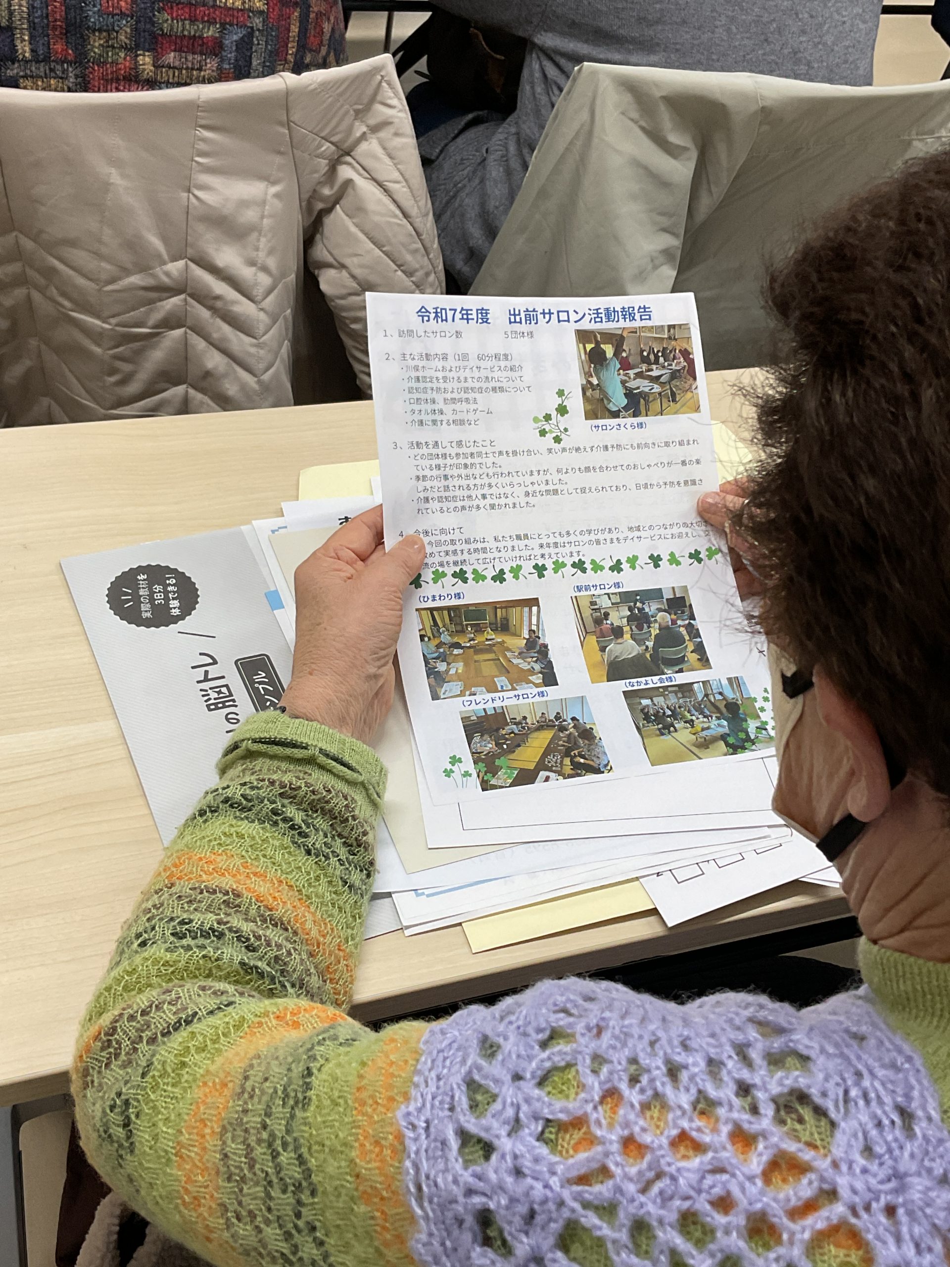私たちからは、今年度の出前サロンの報告と、来年度の予定についてお話をさせていただきました。今年度は5件の団体様の所に伺うことができました。みなさん、介護や認知症について、日頃から予防を意識されているとの声が多く聞かれました。来年度はサロンのみなさまをデイサービスにお迎えし、交流の場を継続して広げて行ければと考えています。