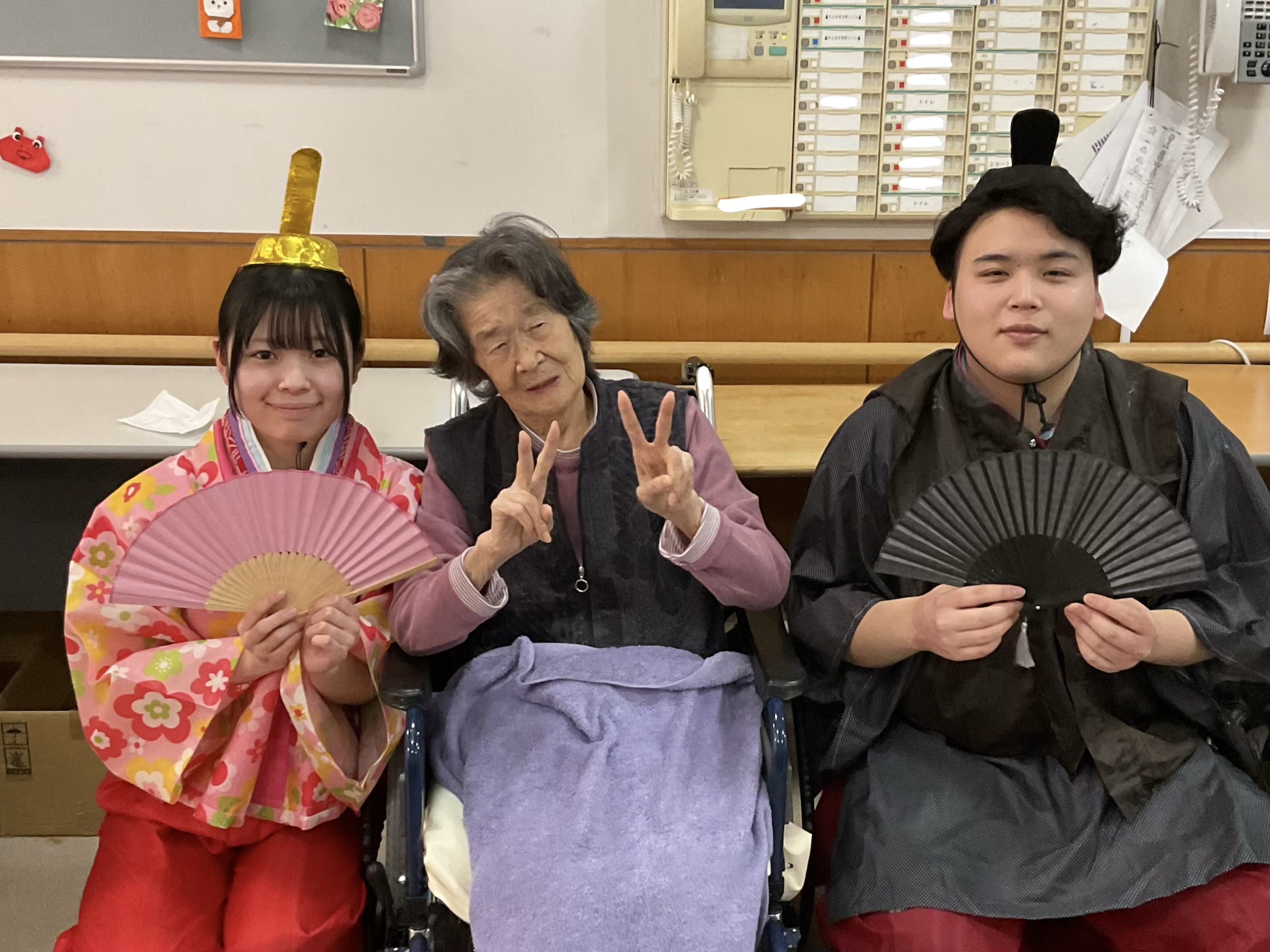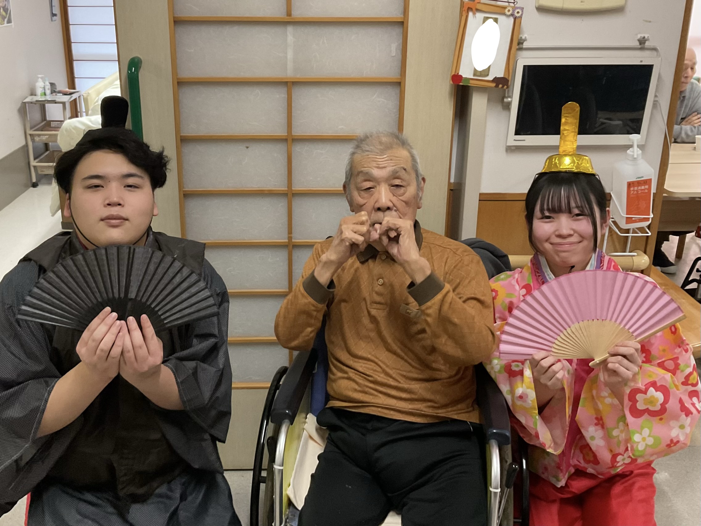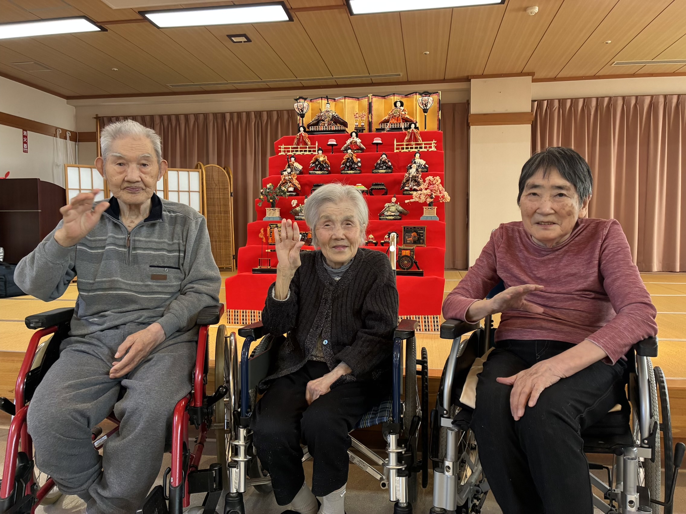 ひな祭り 2026/03/03 ひな祭りを行いました🎎 ホールには大きな雛壇を飾り、華やかな雰囲気の中で楽しんでいただきました。 「立派なお人形だね」「きれいだね」と雛壇を眺めながら、会話も弾んでいました。 また、歌の上手な利用者様が「♪あかりをつけましょ ぼんぼりに〜」と歌ってくださりました。 当日は、職員がお内裏様とお雛様に扮し、利用者の皆さまと一緒に写真撮影を行いました。 お昼にはちらし寿司が提供され、笑顔あふれるひとときとなりました。 « 前のページ 次のページ »