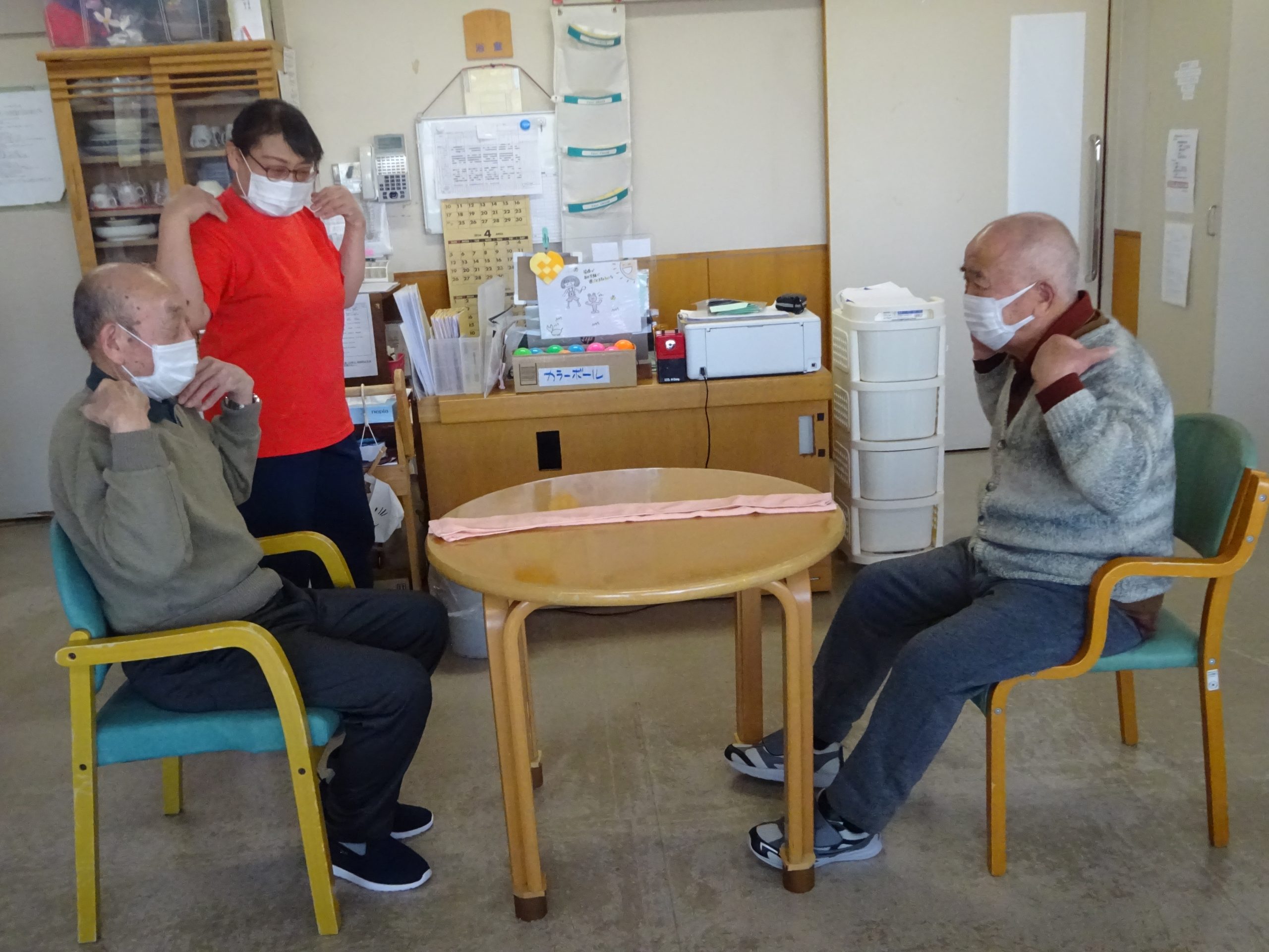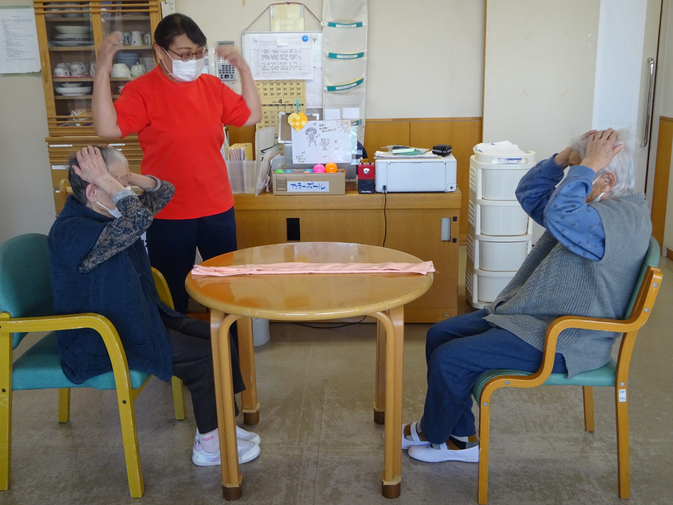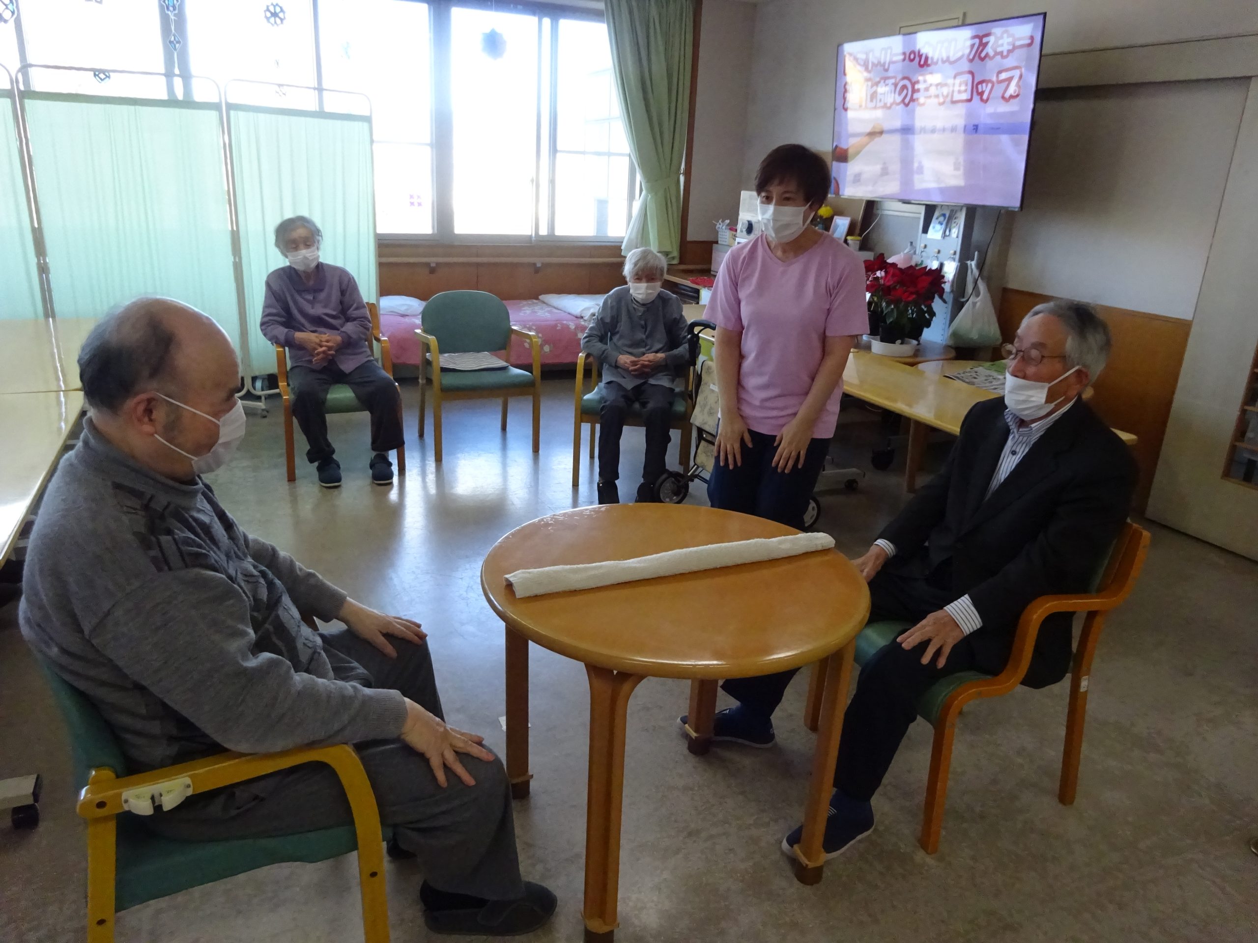 先日、新ゲームで「タオルでじゃんけん」ゲームを行いました。テーブルに置いてあるタオルを早く取った方が勝つゲームなのですが、その前に職員の掛け声に合わせて、ある事をしなくてはいけません。対戦前に、まずは挨拶を。