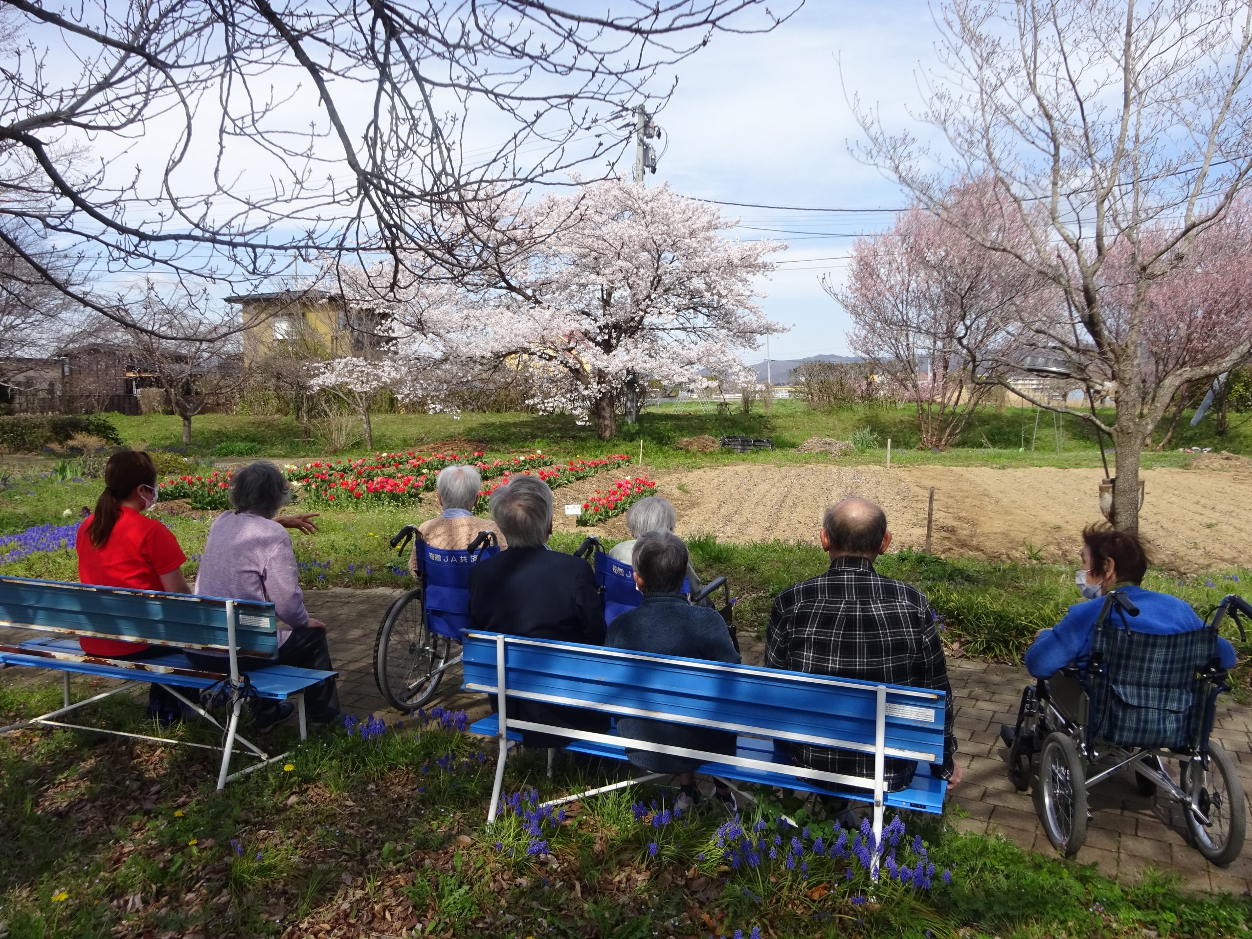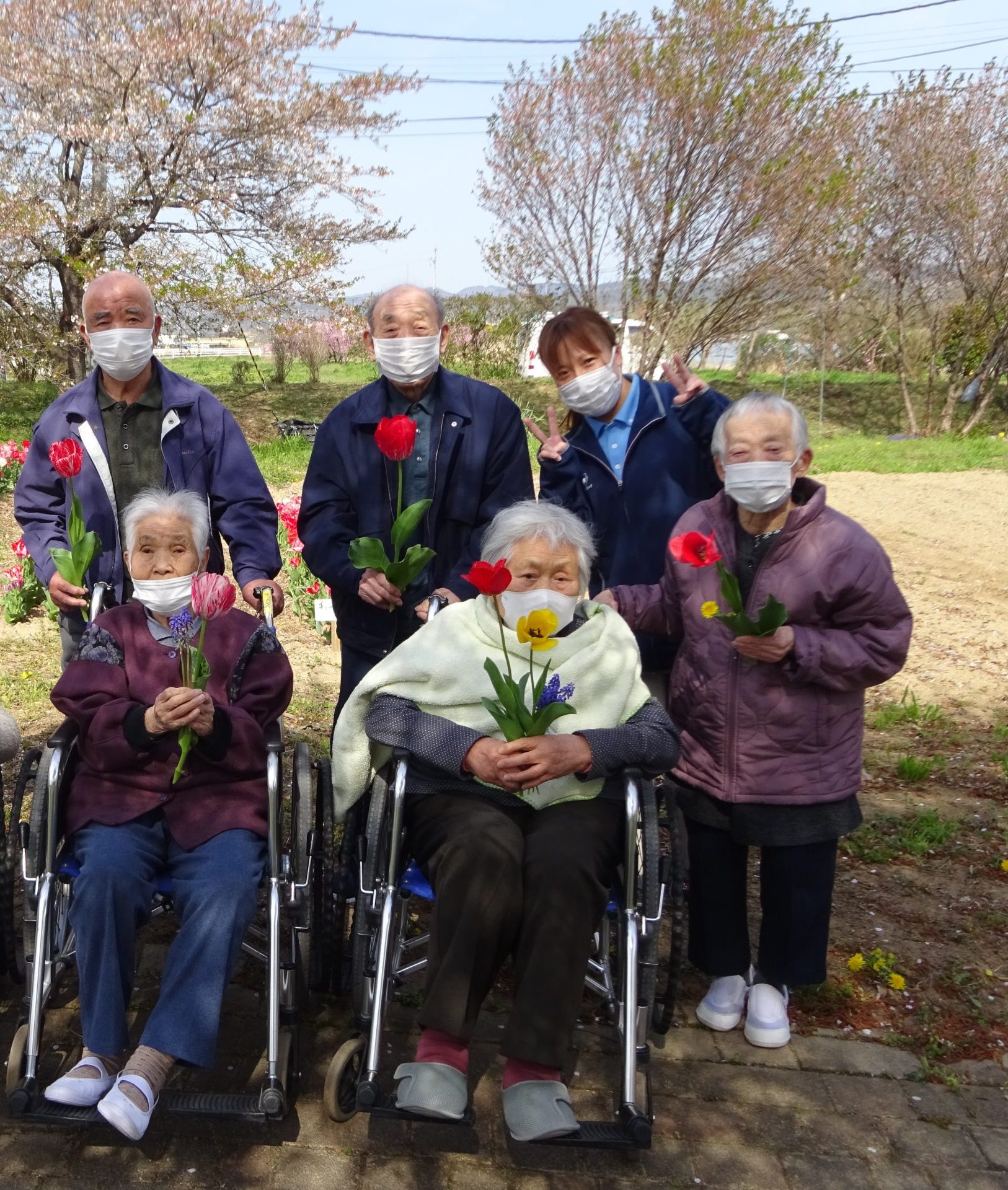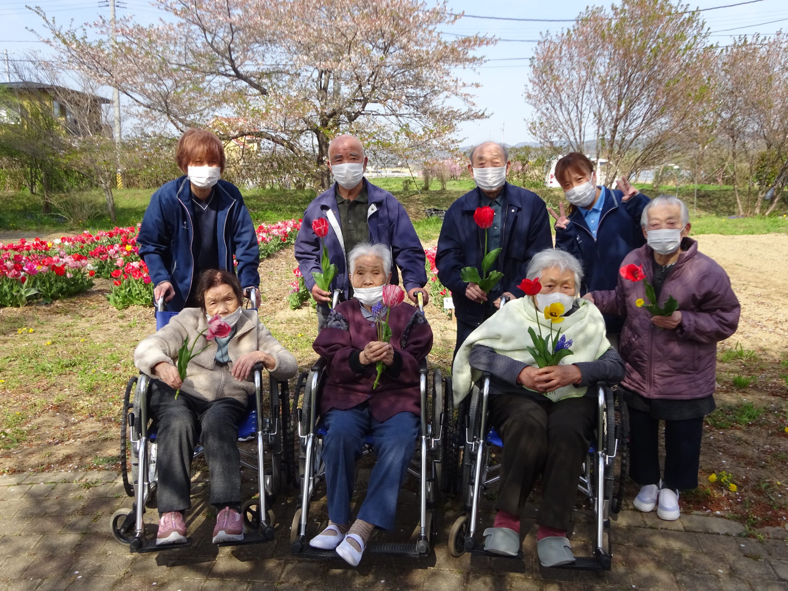 デイサービス 外気浴を楽しんでます 2026/04/17 先日、お花見をしました。満開に咲いた桜を見上げながら心地良い時間を過ごしました。綺麗な桜を見るだけで、自然と笑顔になりました。近くにはチューリップも咲いており「綺麗だなぁ~」と嬉しそうに眺めていました。皆様にチューリップをプレゼントしました。 « 前のページ
